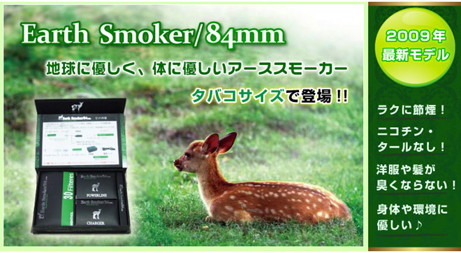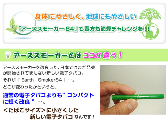 | アーススモーカー84 ¥11,799(税込) 電子タバコ2009年の最新モデルがついに登場!アーススモーカーを改良し最小・軽量化を実現した、新しい電子タバコ『アーススモーカー84』がついに登場!日本ではまだ、発売が開始されてまもない最新の電子タバコ『Earth Smoker84』!!ナント!通常の電子タバコよりもさらに… |  | |